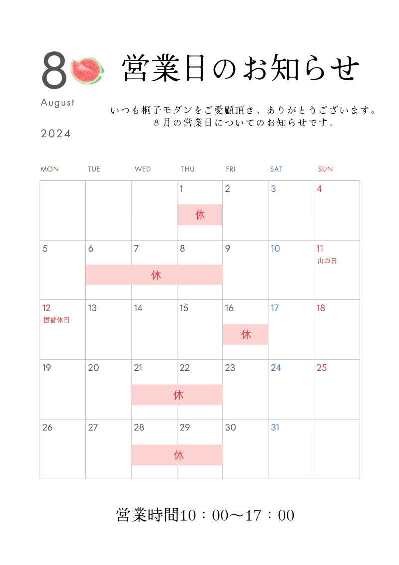 8月の営業日のお知らせです。 お盆は10日~15日まで休まず営業致します。 それに伴い6日と16日にお休みを頂いておりますので御了承下さい。 ご来店をご予定されている方はご確認をお願い致します。 尚、日本橋店は通常通りの日曜・祝日定休となります。 お盆期間中10日~15日は、まな板をご購入頂いた頂いた方に プレゼントをご用意しています! 帰省ついでに、桐子モダンでまな板を新調しませんか?♪ ご来店お待ちしております。