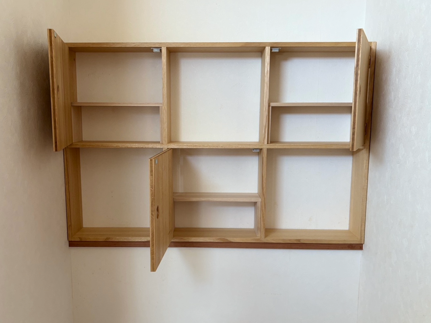 桐は非常に軽量なため、壁への負担を最小限に抑えつつ、大きな壁面収納を実現しました。