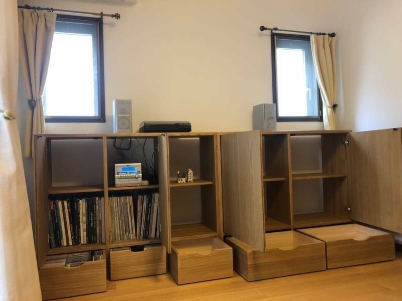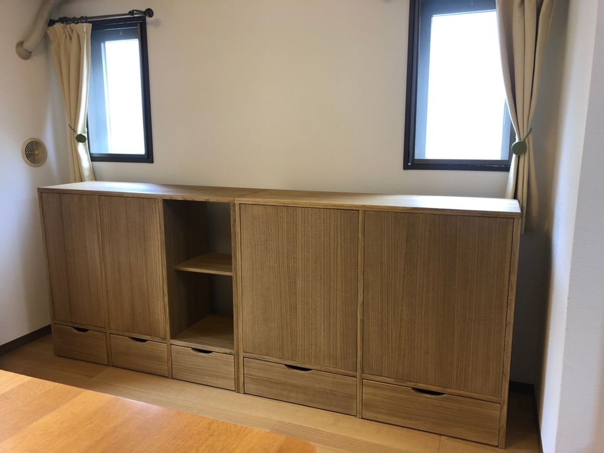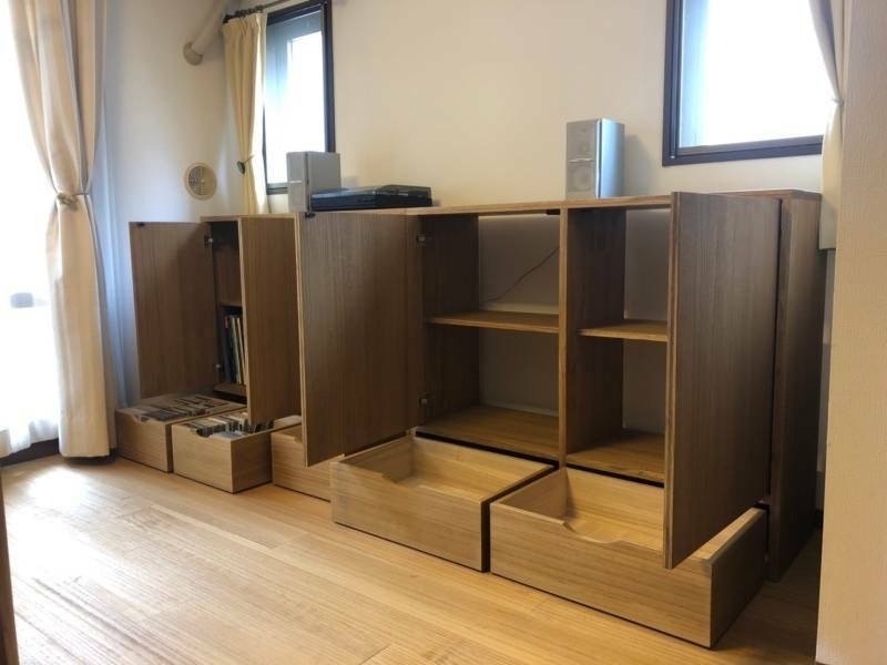 《桐のリビングシェルフ》 お部屋の寸法に合わせてご注文頂いたオーダーシェルフです。 外観はシンプルですが、 実はこんなに収納力抜群なんです! 軽い桐で引出しも楽々。 扉はプッシュ式でスタイリッシュに仕上げました。 お部屋の印象に合わせてお色のご相談も承ります。 お気軽にお問い合わせ下さい。